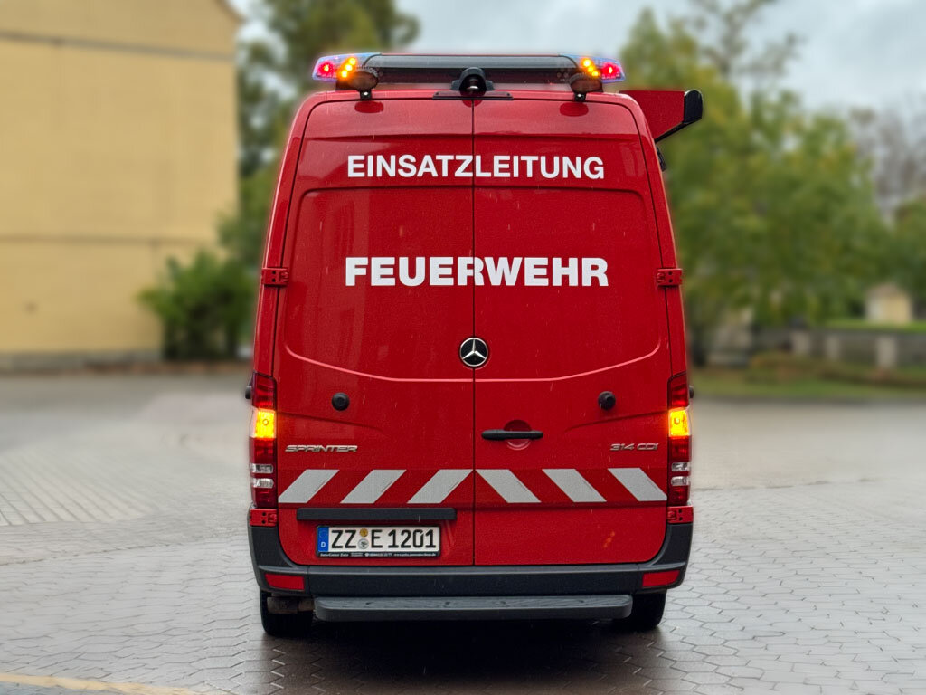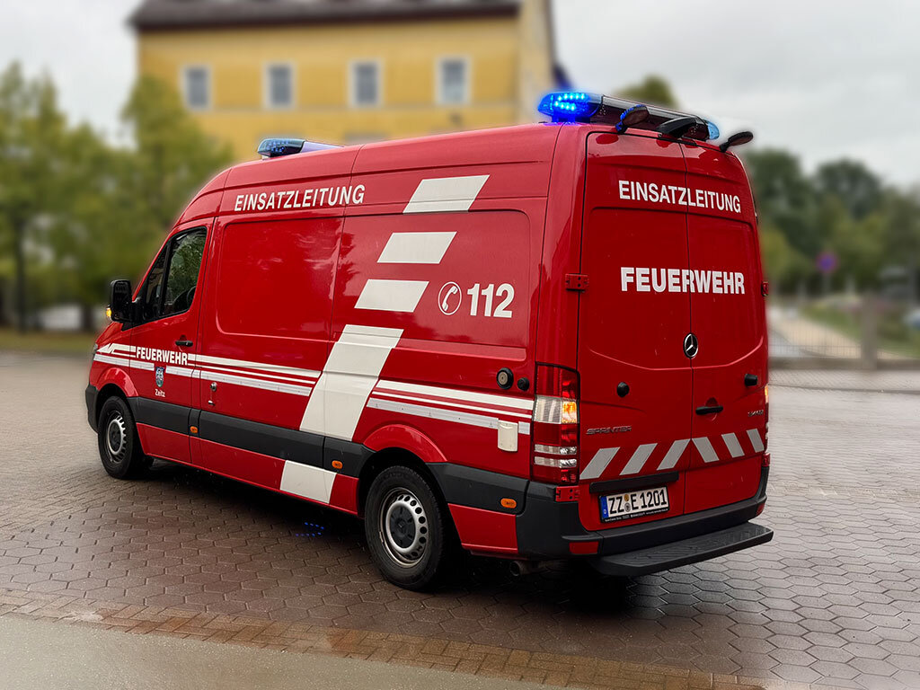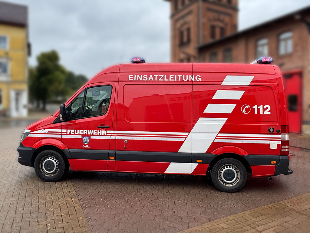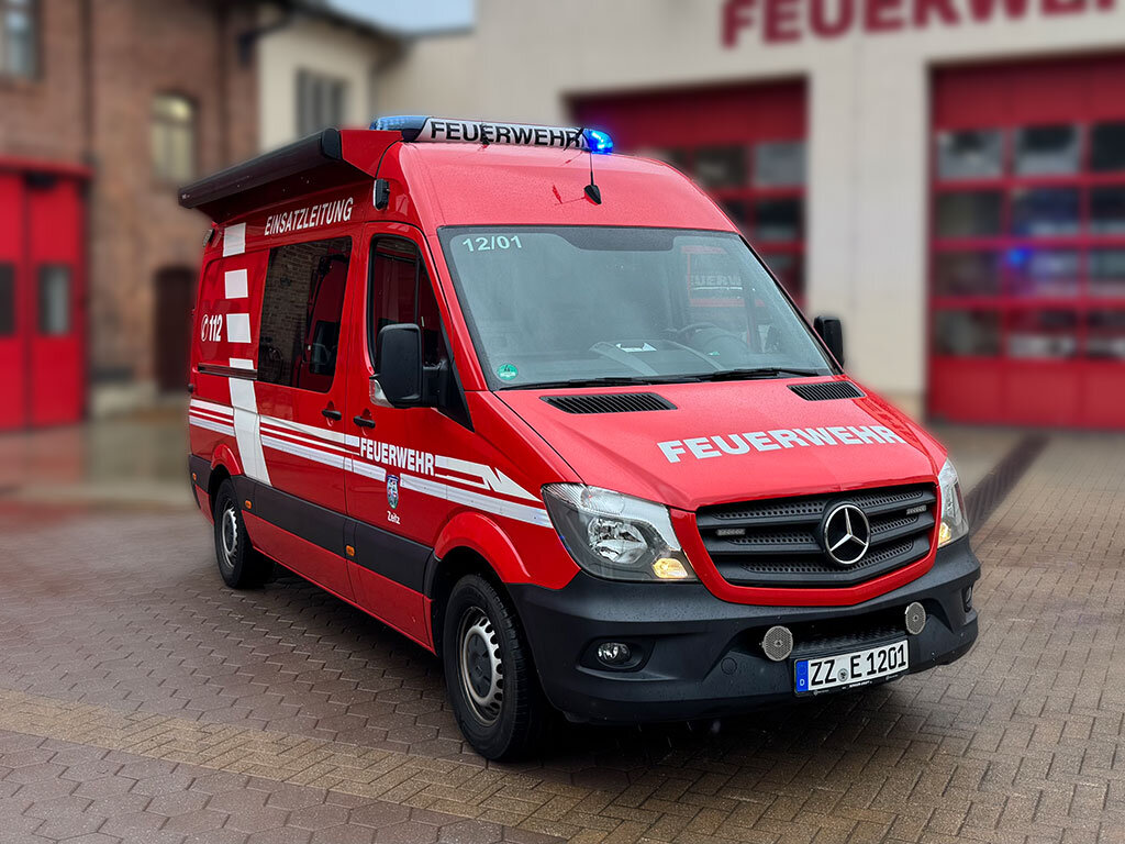 Der Mercedes-Benz Sprinter, der als Fahrzeug der Einsatzleitung bei der Feuerwehr Zeitz genutzt wird, wurde mit einer Doppelbalkenanlage ausgestattet. Der vordere Balken erhielt die Beschriftung FEUERWEHR, der hintere ein integriertes Heckwarnsystem.